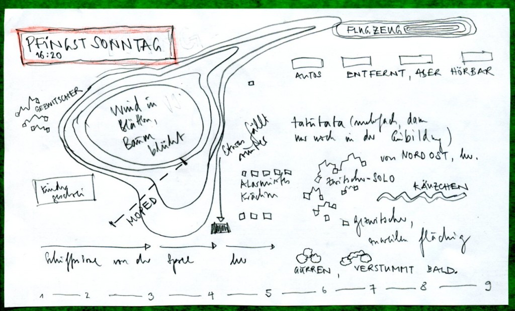“Im Ablauf des täglichen Lebens, wie er es uns hier bekennt, kommen und gehen die parasitären Eingriffe. Einladungen von hier und dort, Einladungen bei der Marquise und beim Vikar, beim Löwen, beim Herrn und bei der Ratte, hinterlistige Verzweigungen, hastige Diebstähle, kleine Geräusche, plötzlich, aber ernstlich für diesmal, fällt die Feder mir aus der Hand. Die kleinen Geräusche, die Unterbrechungen wachsen sich zur Krise, zur Katastrophe aus. Die Decke fällt auf meinen Tisch. Die Wasser der Sintflut ertränken das Tal. Knarren, Geräusche, Chaos. …
