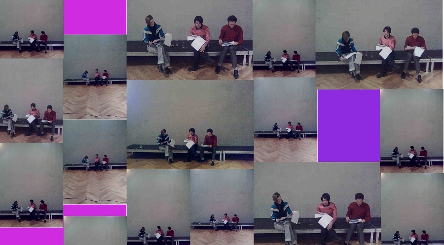 Grau Unterlegtes soll mit grau Unterlegtem an derselben vertikalen Position in einer oder beiden anderen Stimmen zeitlich/rhythmisch koordiniert werden. Das natürliche Sprechen darf dadurch in keiner Stimme behindert werden. Es empfiehlt sich deshalb, einen durchlaufenden Text einfach weiterzusprechen; diejenigen Stimmen, welche zuvor pausiert haben, „hängen“ dann ihre Einwürfe entsprechend „ein“. Kurze Bindestriche meinen Wortzusammengehörigkeit, und dienen vor allem als graphische Hilfen im zeitlichen Gerüst.